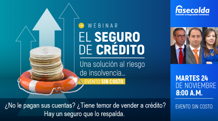 Con el ánimo de dar a conocer la importancia del seguro de Crédito como herramienta para la mitigación del riesgo de impago o mora en el pago de cartera de las empresas, Fasecolda invita al webinar ‘El seguro del Crédito, una solución al riesgo de insolvencia’, el próximo 24 de noviembre, a las 8:00 a.m.
