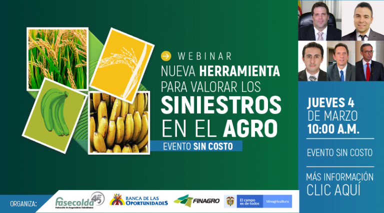 Fasecolda, en compañía de Banca de las Oportunidades, Finagro y el Ministerio de Agricultura, invitan al webinar ‘Nueva herramienta para valorar los siniestros en el agro’, el próximo jueves 4 de marzo, a las 10:00 a.m.